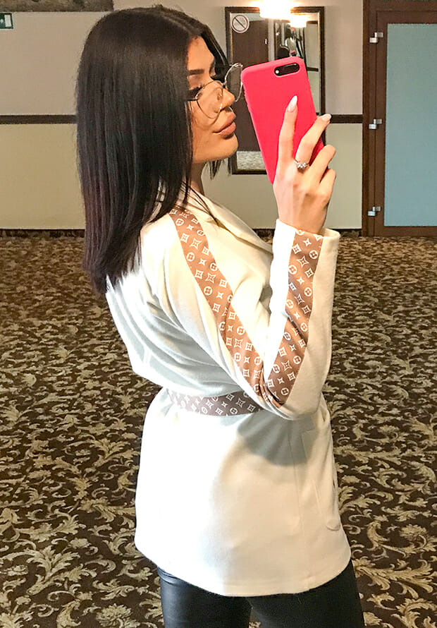 Płaszcz biały z lampasami na rękawach i z paskiem w ciemnym kolorze we wzorek. Wymiary: rozmiar 36 długość 74cm, biust 48cm, rękaw 58cm, biceps 15cm, rozmiar 38 długość 75cm, biust 49cm, rękaw 58cm, biceps 15cm, rozmiar 40 długość 76cm, biust 50cm, rękaw 58cm, biceps 15cm, rozmiar 42 długość 79cm, biust 52cm, rękaw 60cm, biceps 15cm.